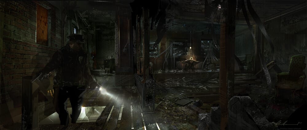 The grungy and bleak tone of Snyder’s Gotham begins to come to life in this concept art by Christian Lorenz
